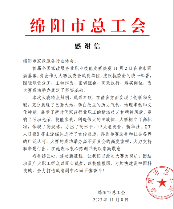 綿陽市家政服務(wù)行業(yè)協(xié)會(huì)力助首屆全國家政服務(wù)業(yè)技能競賽決賽在綿陽圓滿落幕,綿陽市總工會(huì)高度贊揚(yáng),綿陽市美新家政熱烈祝賀!